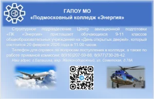 10 февраля, 2026Структурное подразделение Центр авиационной подготовки «ПК «Энергия» приглашает обучающихся 9 - 11 классов общеобразовательных учреждений на «День открытых дверей», который состоится 20 февраля 2026 года в 11.00 часов. Телефон для справок по вопросам поступления в колледж, а также по работе приемной комиссии: 8(916)207-59-88, 8(977)730-28-42. Наш адрес: г. Балашиха, мкр. Железнодорожный, ул. Советская, д.78А
