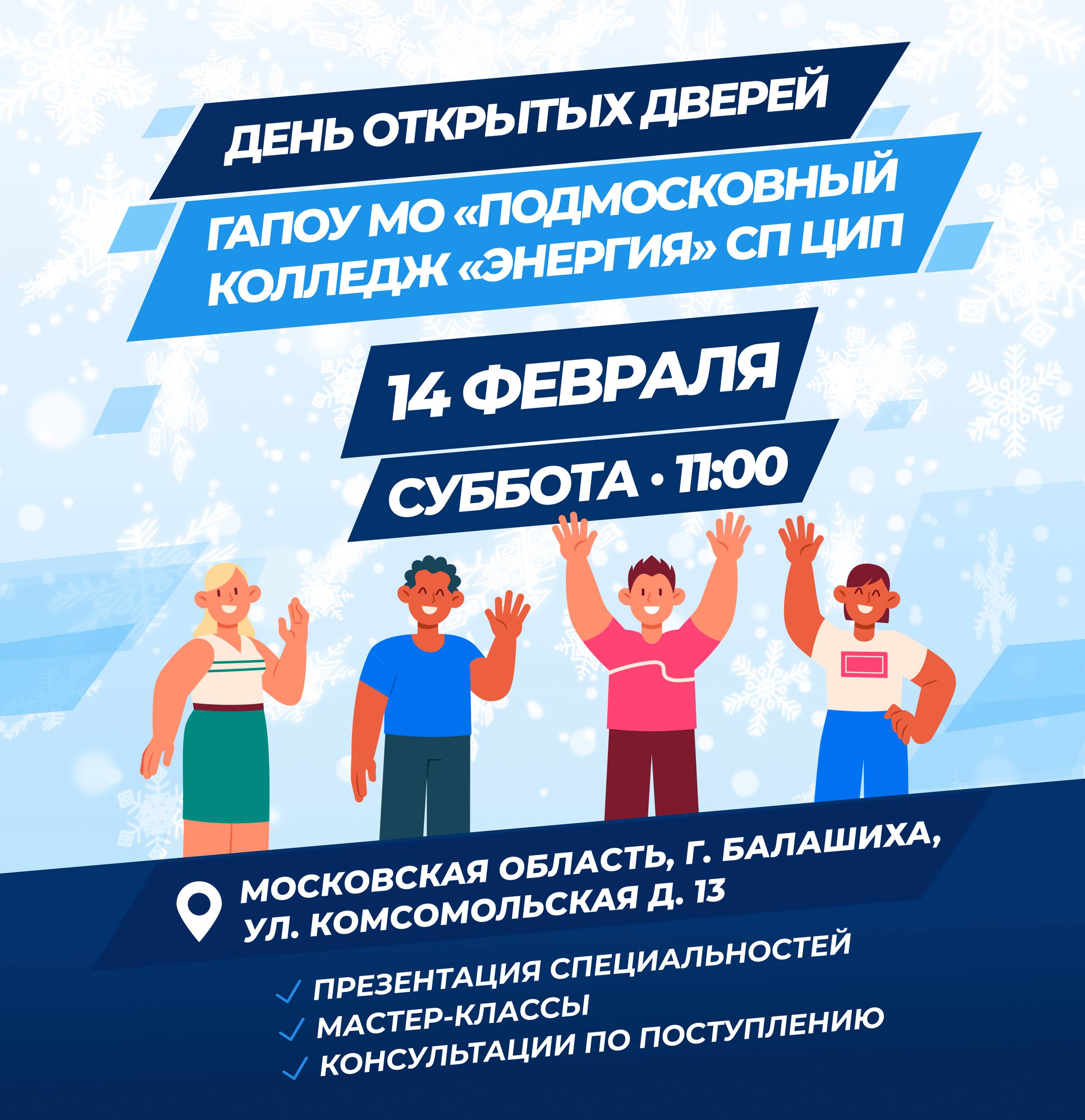 Приглашаем вас на День открытых дверей в ГАПОУ МО «ПК Энергия» (СП ЦИП), который состоится 14 февраля 2026 года.