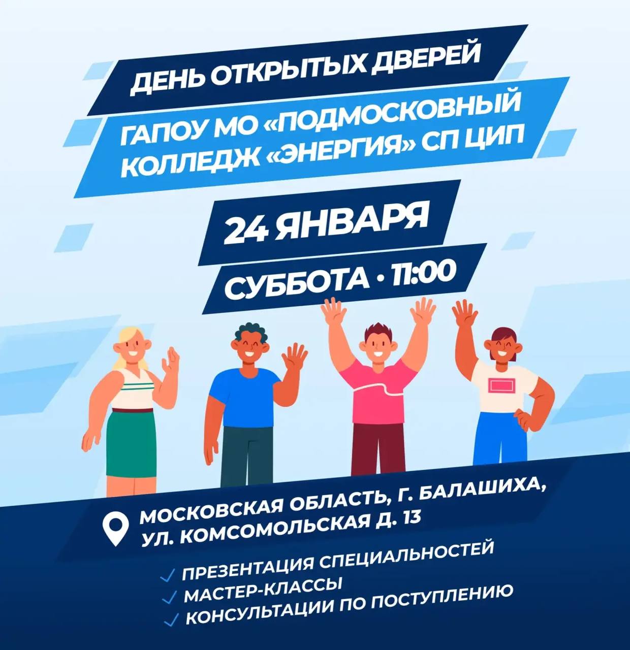 Приглашаем вас на День открытых дверей в ГАПОУ МО «ПК Энергия» (СП ЦИП), который состоится 24 января 2026 года.
