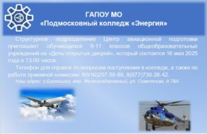 3 марта, 2025Структурное подразделение центр авиационной подготовки ГАПОУ МО «ПК «Энергия» приглашает выпускников 9-11 классов общеобразовательных учреждений на «День открытых дверей», который состоится 16.05.2025 года в 13.00 часов.