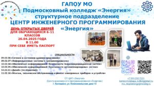 24 апреля, 202526.04.2025 года в 11:00 структурным подразделением центр инженерного программирования «Энергия» ГАПОУ МО Подмосковный колледж «Энергия» проводится День открытых дверей по адресу г. Балашиха, ул. Комсомольская 13. Ждем обучающихся 6-11 классов, а также родителей. При себе иметь паспорт.