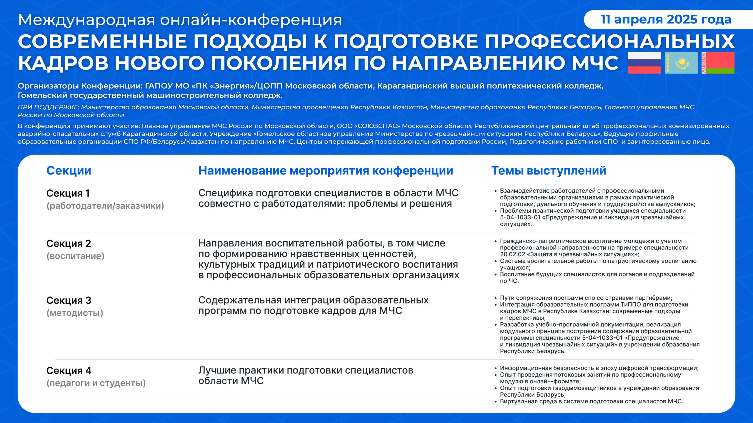Профориентационные понедельники в #ПКЭнергия!11 марта, 2025🟢🍃☘️☘️ В преддверии Дня Земли студенты #ГАПОУМОПК_Энергия12 марта, 2025 Международная конференция МЧС 12 марта, 2025 Категории Новости Тег Ссылка на форму регистрации: https://forms.yandex.ru/u/67bf186c90fa7b835dc78559/ Поделиться Похожие записи29 октября, 2025Приглашаем на День открытых дверей в СП ЦСЛП «Энергия»Подробнее28 октября, 2025Разговоры о важном и еженедельная линейка в #ПКЭнергияПодробнее28 октября, 2025Ежегодная региональная студенческая научно-практическая конференцияПодробнее