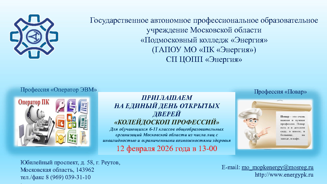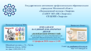 Приглашаем вас на День открытых дверей в ГАПОУ МО «ПК Энергия» (СП ЦОПП), который состоится 12 февраля 2026 года.