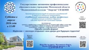 31 марта, 2026Профориентационные консультации по вопросам поступления в колледж "Энергия" Центр оборонно-промышленной подготовки. Ждем вас в по субботам с 11.00 до 15.00 на встречах офлайн-онлайн формате.