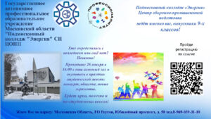 Разговоры о важном19 января, 2026 Профориентационные мероприятия для 9х классов в СП ЦОПП 26 января 20 января, 2026 Категории День открытых дверей Новости Тег Профориентационные мероприятия для 9х классов в СП ЦОПП 26 января Поделиться Похожие записи19 января, 2026Разговоры о важномПодробнее19 января, 2026День открытых дверей в ГАПОУ МО «ПК Энергия» (СП ЦИП)Подробнее13 января, 2026Разговоры о важном: Как создают мультфильмы?Подробнее